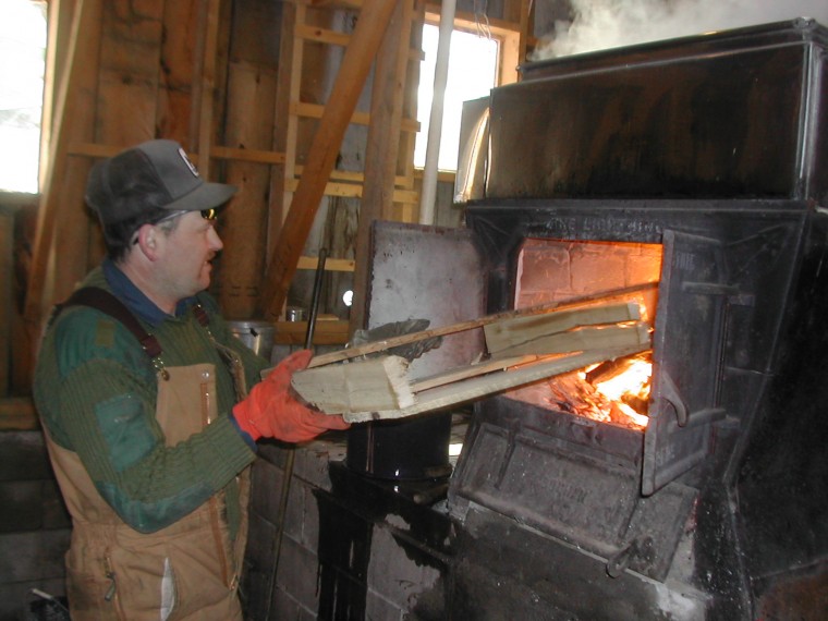 Bob Parsons slid a slap of wood into a fire box as vapor rose from boiling sap last Thursday in a sugarhouse on his family’s farm in Gorham.