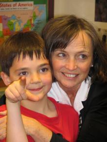 Danny Pike and his teacher, Ann Bottoms, are enjoying his surprise party at Raymond Elementary School. The Make-A-Wish Foundation of Maine is sending Danny and his family to Walt Disney World in Florida.