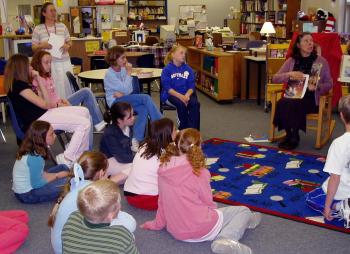 Marilyn Taylor, a children’s librarian at the Scarborough Public Library and a surprise guest, reads to Wentworth students at the MSBA celebration.
