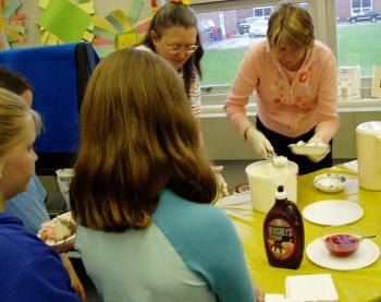 Wentworth School librarians, Sandy Doehler, left, and Sue Nakanishi serve ice cream to the students at the school’s Maine School Book Awards celebration.