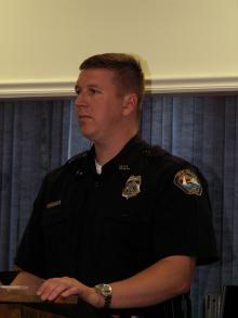 Frye Island Police Officer Eric Pierce addressed the Raymond Board of Selectmen last Tuesday. Frye Island will be providing Raymond with a minimum of 20 hours of police protection a week.
