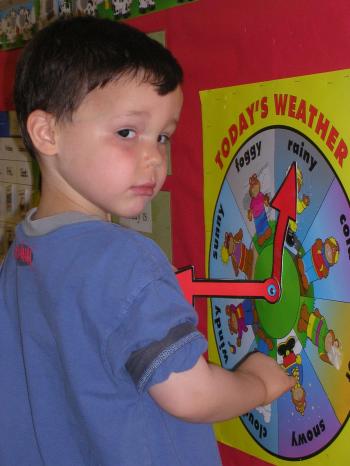After looking out the window, Ben reports the weather to the rest of his classmates in the three-to-one classroom at the REACH School.