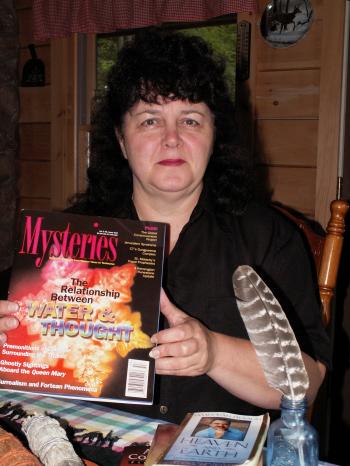 Paranormal investigator Ann Hall sits at her table with some of the tools of her trade. She is holding an August 2005 copy of