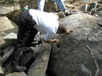 What caused the most concern, however, was a large boulder with a hole drilled into it. Coming out of the hole, which was filled with small pieces of gravel, was an approximately 6-inch length of orange wire that looked like it could have led to an unexploded charge. Seeing that, Fire Chief Gary Littlefield and Fire Inspector Lt. Chuck Jarrett made the decision to close off the site and call in experts from the state Fire Marshal’s office and the State Police.