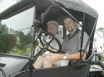 Ryan Irish, driving a 1919 Model T Ford, is accompanied by his grandfather, Arthur Caron.