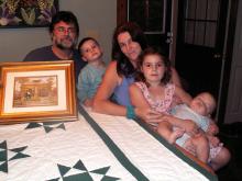 Kurtis Clements and his wife, Ann Bragdon with their children Nate, Haley and Grady at their camp in Naples. Clements is holding a drawing of the home they fled in New Orleans.