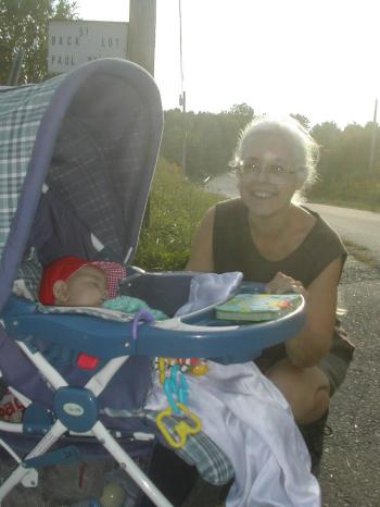 Polly Smith and her great-grandson, Joey, take a break on Thursday. Smith picks up litter every day on Gorham roads while giving Joey a ride.