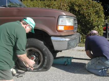 Paul Council (right) and Jimmy Seeley (left), both of Main Street work to fix a tire that had been slashed by vandals in a Mechanic Street parking lot last week.