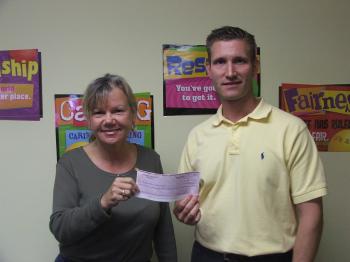 Dana Redmond, Gorham Business & Civic Exchange, and Rev. Gordy Johnson, pastor of the Portland Faith Center, hold the check being sent to help community of Bayou La Batre rebuild.