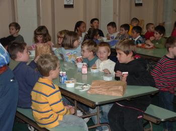 Kids at Saccarappa School enjoy breakfast in the school’s cafeteria after taking walking to school Thursday morning. As a part of the school’s Walk Your Kid to School day, kids and parents who walked to school were invited to a breakfast in the school cafeteria.