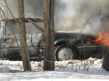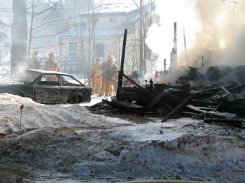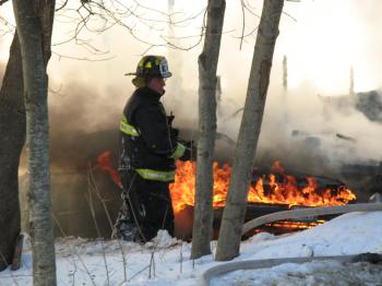 A firefighter walks by the burning remains of a car at the scene of a house fire on Orchard Street in Windham Monday afternoon.