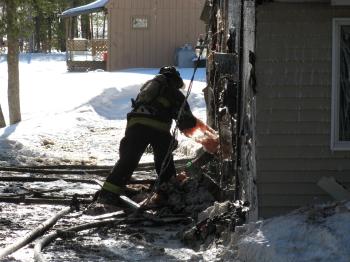 A firefighter pulls damaged insulation from the side of a home on Orchard Road in Windham. The house was damaged from the heat from the flames of the fire that destroyed the house next door.