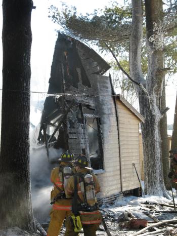 No one was injured in a fire that destroyed a camp-style home and two cars at 14 Orchard Road Monday afternoon. The heat from the blaze also caused major damage to the house next door.