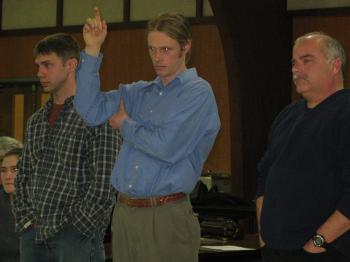 Parkmeeting Paul Johnson, 29, prepares to express a concern over the proposed community park that would be built near his farm. An early version of the park had a dog section near his rabbits and chickens. Also pictured is Dan Johnson (left) and Michael Barter.