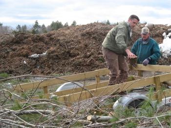 LeafandBrush1-3: (From left) Scott Hedgecomb and Dave Hedgecomb unload a trailer full of forest waste at the leaf and brush pile in Windham. “Spring is a cleanup time, it comes in handy to bring it here without having to burn it,” Scott Hedgecomb said. The Maine Department of Environmental Protection told the town it needs to get a transfer station license if it wants to stay open.