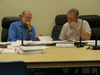 Busquepublichearing: Keith Williams and James Hanscom of the Planning Board look over a map of the new proposed Busque quarry.