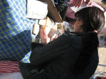 Farmersmarket5-6: Nicole DiMauro slices off a hunk of glycerine soap for a customer at the Windham farmers market. She, her mother and seven female siblings from New Gloucester call their homemade foods and home products company the Farmer’s 8 Daughters.