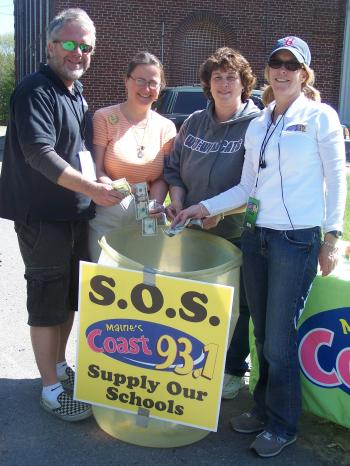 Tim Wright, of Coast 93.1; Sue Perrino, a teacher at Memorial Middle School in South Portland; Ruth Libby and Eva Matteson, of Coast 93.1, are participating in a 50-hour fundraiser to help Ruth’s Reusable Rs??? that ends 9 a.m. on Wednesday morning.