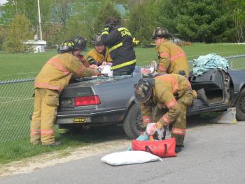 Scare4: Fire fighters cut open this car to remove the mock victim. The other car was ignored because the occupants were considered dead on arrival. Cobb’s Collision of Windham donated and later removed the vehicles.