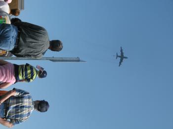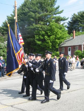 Hundreds of people lined Route 202 from the town offices entrance on School Road to the Whindham High School. A low-flying refueling plane from the Maine Air National Guard based in Bangor was carefully timed to cross over the high school as a band played the national anthem to open the wreath-laying ceremony at the monument to fallen Windham soldiers in front of the high school.