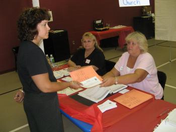 Windham07election4: Bonnie Hicks, 44, of Frog Pond Road takes her ballot from poll volunteer Pam Barr at Tuesday’s state and municipal election. Also pictured is poll volunteer Paulette Shepard.