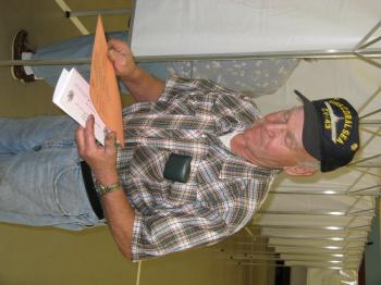 Windham07election1: Charlie Melanson, 76, of Windham prepares to turn in his ballot on Tuesday’s state and municipal election.