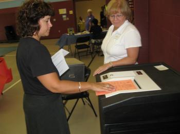 Windham07election5: Bonnie Hicks, 44, of Frog Pond Road places her completed ballot in a voting machine under the supervision of poll volunteer Jane Diamond, who is the wife of Cumberland County State Senator Bill Diamond.