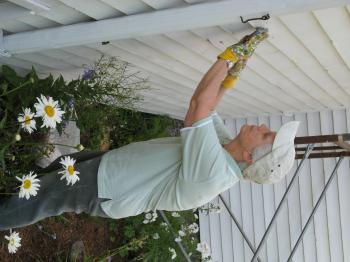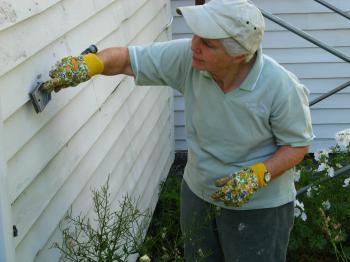 ParsonSmith1-3: Elaine Dickinson, 67, peels some old paint off the side of her house, which just happens to be the oldest historically intact house in town. The Windham Historical Society is trying to come up with $700,000 to purchase the building but has had trouble fund raising.