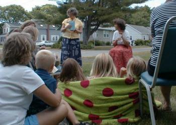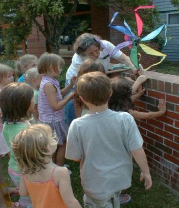 Marilyn Taylor, Youth Services Assistant at the Scarborough Public Library, guides children in creating a Weather Station outside the Library as part of the Summer Reading Program. Kids can keep their own weather journal by checking the thermometer, water gauge and wind sock each time they visit the Library and recording their observations.