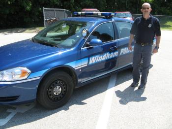 WindhamPoliceCapacity1-2: Windham Community Services Officer Matt Cyr with one of the patrol cars that his department uses to keep Windham safe. Officials say the department have a few obstacles that make staying fully staffed difficult.