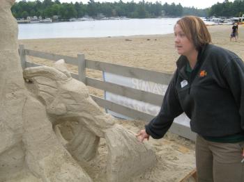 SunshineSandCastle02 Camp Sunshine Events Coordinator Ashley Riley stands with a small-scale mock up of the 35-foot dragon her organization is building to win the Guinness World Record for the world’s tallest sandcastle.