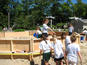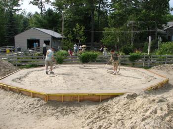 Hancock Lumber provided the first 25 dump truck loads of sand to the shore next-door at Camp Sebago. Volunteers carried the sand, one bucket at a time, to a large wooden octagon frame. The sand inside the wooden forms was then mixed with water and tamped down.