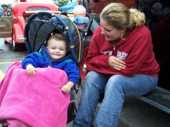 The rain didn’t dampen the spirits. Merchant’s fianca, Crystal Peterson of Gray, attended with 2-year-old son Zachary Petersen-Merchant. Riding in a baby buggy with a hood and wrapped in a blanket, the young fellow was all smiles.