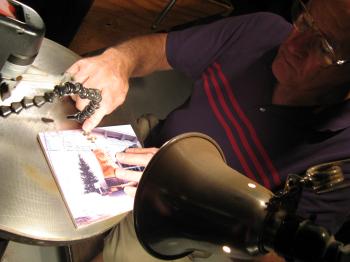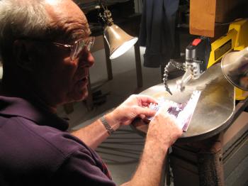 Puzzles3-6 Brown uses a blade 8/1000 of an inch wide to cut his puzzles. All of his cuts are spontaneous and quick. The black segmented device next to the blade blows air to remove the sawdust from fresh cuts.