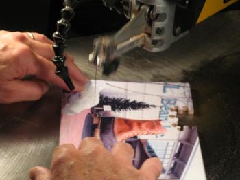 “I don’t touch the edges when I cut,” he said. Constant finger contact can cause the image to loosen so Brown now moves the uncut board under the saw by pressing down on the board and gliding it under the blade.