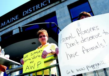The high-profile case has drawn attention of animal rights activists. Robert Fisk, director of Maine Friends of Animals, the group that organized the protest outside of the court house, said about 50 people from his group supported the animal welfare program. Fisk said the kennel had 80 violations in three years.
