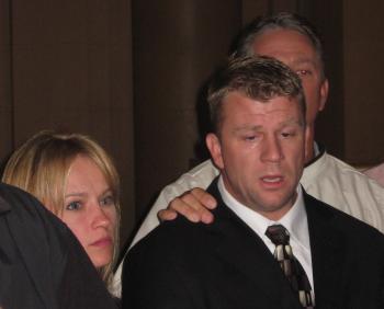 Heather and a tearful Robert LaPointe emerge from the Cumberland County Courthouse Wednesday after he was convicted of two counts of aggravated operating under the influence during a fatal collision on Long Lake in Harrison in August 2007. The jury deadlocked on two manslaughter and one reckless conduct charge in the deaths of Terry Raye Trott and Suzanne Groetzinger.