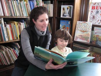 (Berry library 2) – Claudine Emerson, librarian at Berry Memorial Library in Buxton, reads to her daughter Abigail, 4, on Friday. The library celebrated its 80th birthday Saturday.