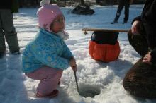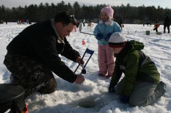 On a snow covered pond, families covered the ice, setting up traps over holes in the ice and jigging, or bouncing fishing poles to move the bait up and down.
