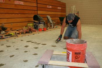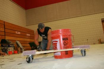 Colby Boppel, of New England Flooring, works on the new gymnasium floor at Scarborough High School.