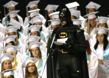 A surprise speaker, Batman, speaks to Windham High School graduates at their commencement ceremony.