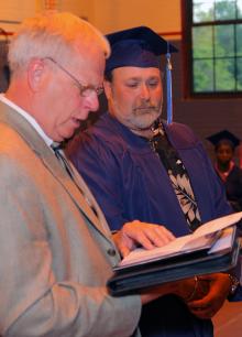 Walter Ridlon of Central Maine Community College presents Jeffrey Robinson, right, with the “Courage to Grow” award at the Gray-New Gloucester Adult Education graduation. The award recognizes Robinson’s persistence and determination to complete his diploma requirements. Robinson was among 44 students who received diplomas at the June 4 ceremony at the Newbegin Community Center in Gray.