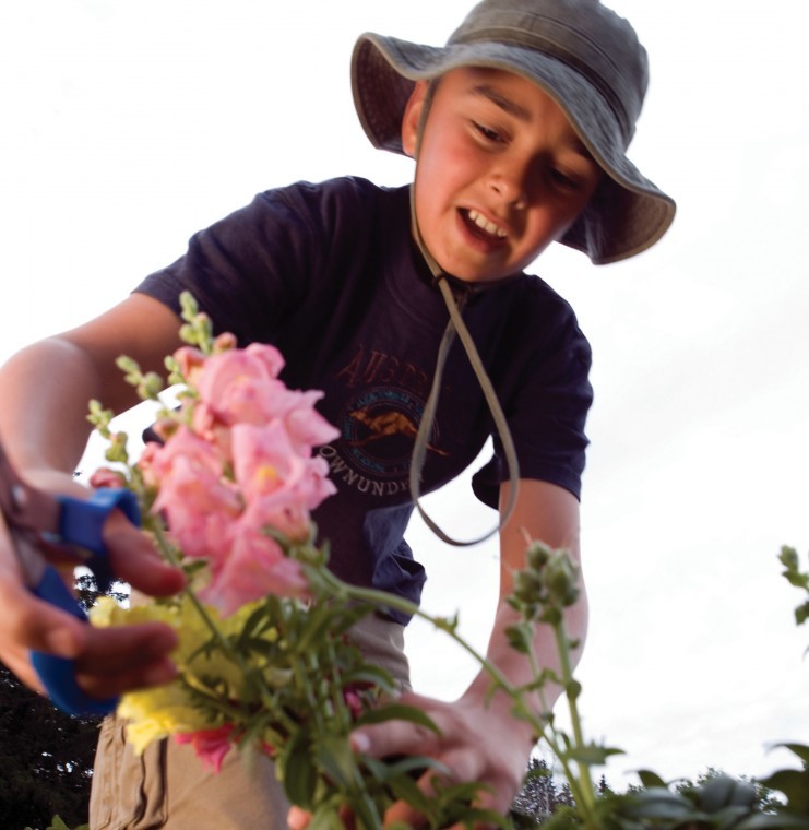 Lars Gundersen of Cape Elizabeth, evidently no stranger to Norm Jordan’s flower garden, wields a practiced pair of scissors as he collects a colorful bouquet destined for the 50th wedding anniversary of his grandparents, Carole and Guy Mainella. (Photo by Rich Obrey)