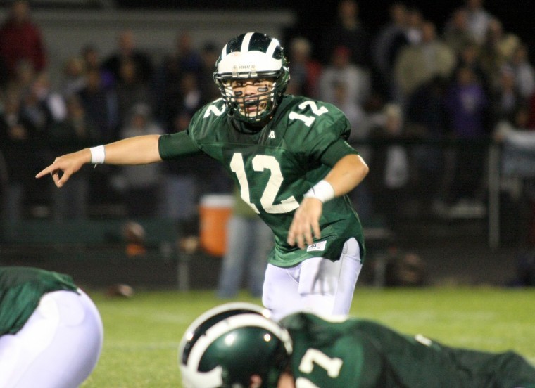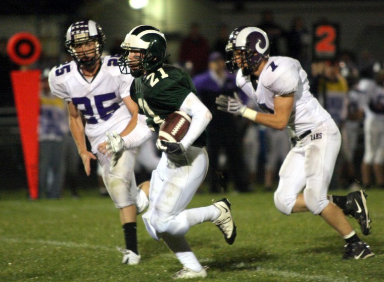 Bonny Eagle quarterback Ryan Nason tries to break a tackle and follow blocker Corey VanDeventer during Thursday night’s game against Deering, won by Bonny Eagle, 41-21.