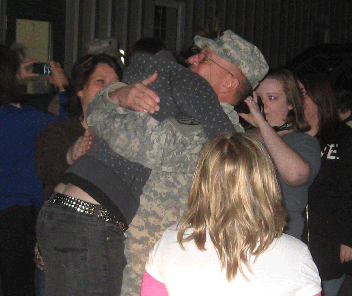 Keith Gorham embraces family and friends upon his return after 10 months serving in Afghanistan with the Maine Army National Guard. “I was very overtaken,” Gorham said of the welcoming party. (Staff photo by Robert Lowell)
