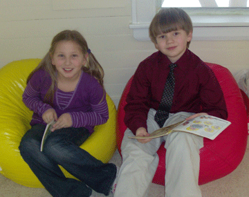 Sydney Breard, 7, and Timothy Holbrook, 8, both students at Songo Locks School in Naples, take a break from reading in the Casco/Naples Before and After Care program last week. The program has just moved into a new space at the Naples Grange/Edward Singer Center. (Courtesy photo)