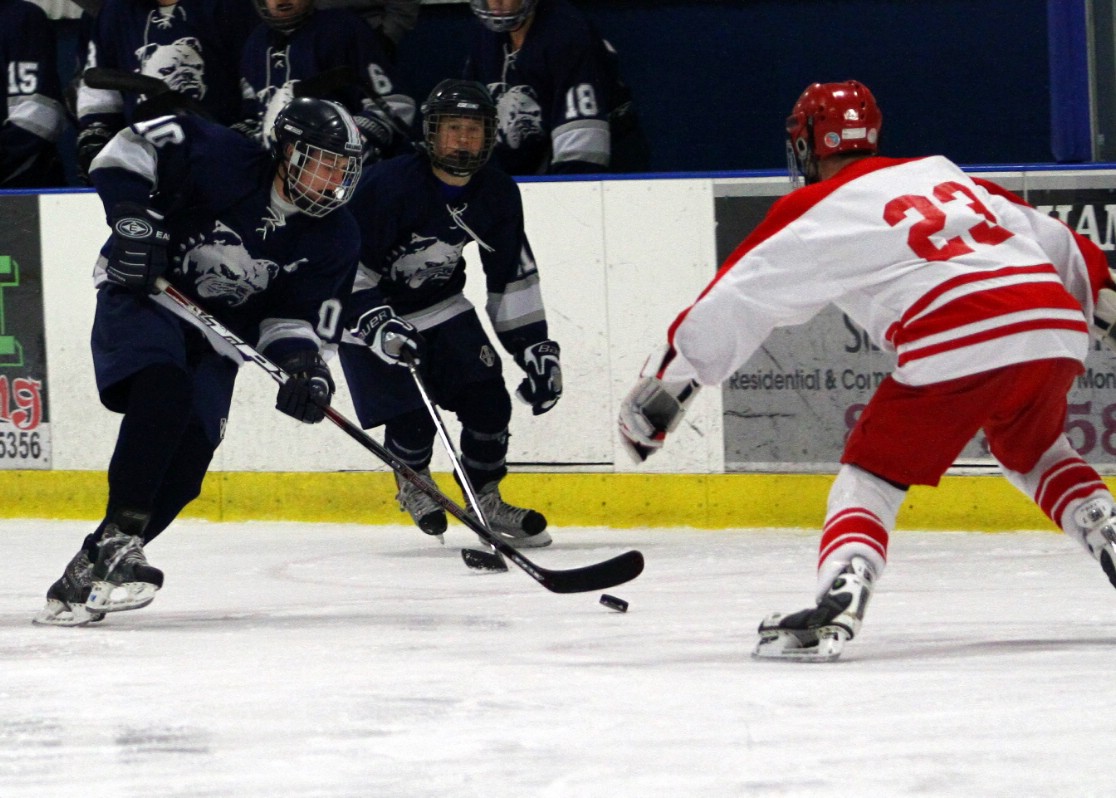 Portland briefly gained control of the puck along the boards and had the chance to clear the zone again, but Red Riots junior forward D.J. Conley and senior Aiden Boyce converged at the last second and managed to just barely keep the puck from trickling out. Pushing, kicking and hacking away with a pair of Portland skaters doing much the same, Conley and Boyce prevailed when the puck bounced loose toward center ice and found Whitten alone just above the circle on the left side.