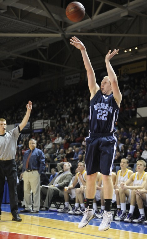 Westbrook’s Andrew Beckwith puts up a shot during the first half of Saturday’s Western Class A championship at the Cumberland County Civic Center. Beckwith had 14 points, but the Blazes fell to Cheverus 56-46.