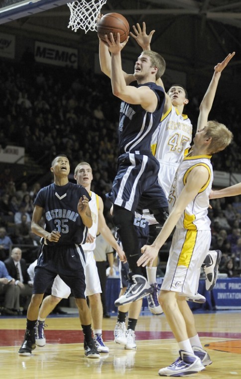 Westbrook’s Andrew Beckwith goes in for a layup during the first half of the Western Class A championship against Cheverus on Saturday. The Blazes fell short in their bid for the regional title in a 56-46 loss.