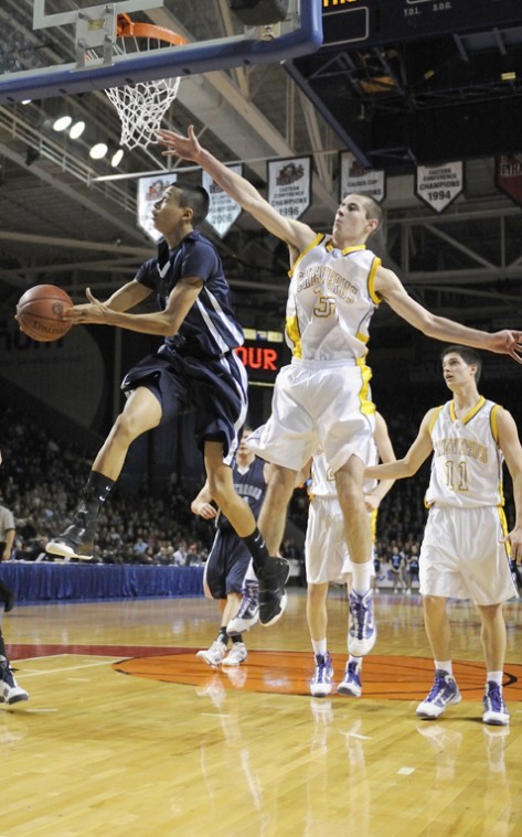 Westbrook’s Jose Nouchanthavong goes up for a reverse layup during Saturday’s Western Class A final against Cheverus. The Blazes fell short of the title with a 56-46 defeat.
